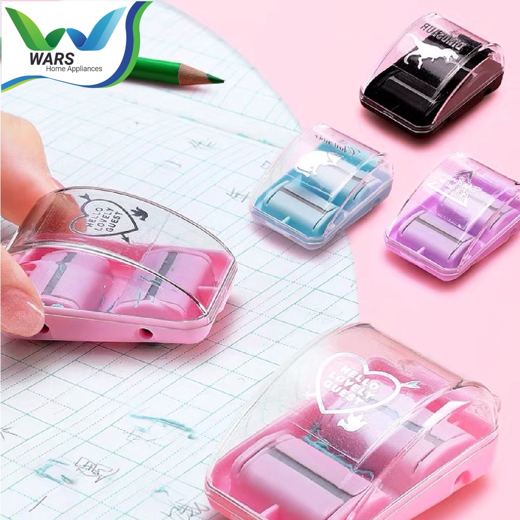 Penghapus dengan alat untuk membersihkan sisa hapusan sehingga meja atau tempat belajar tidak kotor oleh sisa penghapus, sangat efektif dan cocok dibawa karena bentuk yang kecil dan fungsional.